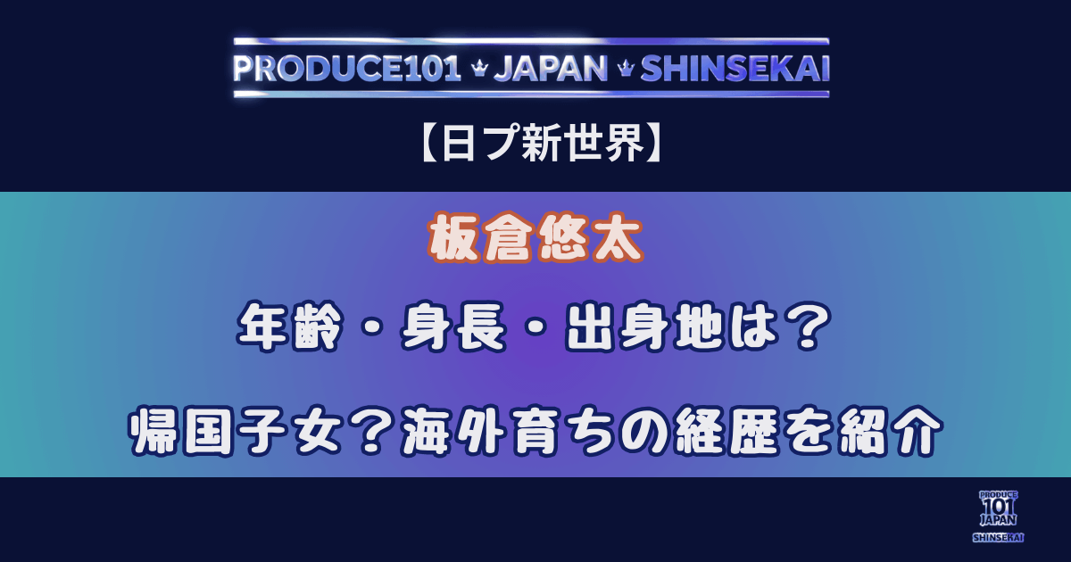 今回は「PRODUCE 101 JAPAN 新世界」で輝きを放つ板倉悠太(いたくら ゆうた)さんについて、年齢や身長などのプロフィール、帰国子女の経歴、そして見逃せない魅力をご紹介しました。