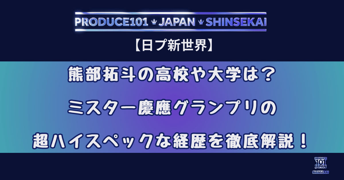 本記事では、熊部拓斗さんの出身高校や大学、ミスター慶應での活躍、そして日プ新世界での注目ポイントまで、熊部拓斗さんの魅力を徹底解説します。