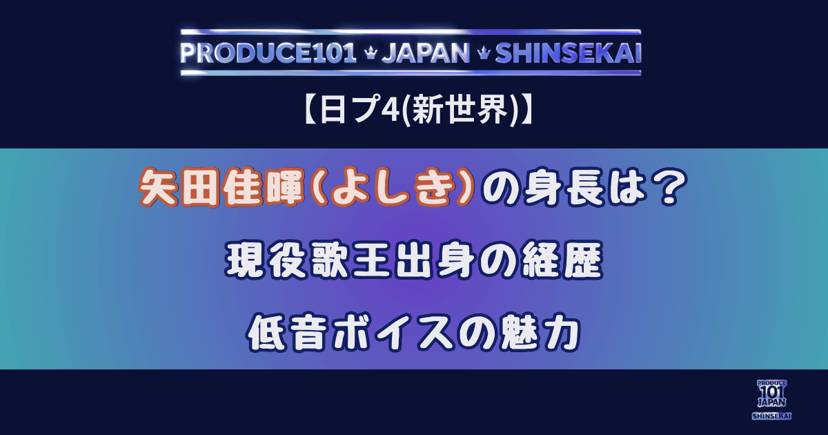 この記事では、矢田佳暉さんの身長やプロフィール、現役歌王での活躍、高校時代から日プ新世界に至るまでの経歴、そして“沼すぎる”低音ボイスの魅力を詳しく解説します。